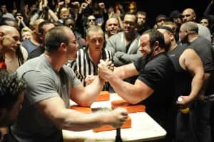 There really is such a thing as organized arm wrestling tournaments. `Game of Arms' takes viewers a long way from the days of duels at the end of the bar after a night of drinking. The series follows the members of arm wrestling clubs in such cities as Erie, Pennsylvania; Kansas City, Kansas; Sacramento, California; Baton Rouge, Louisiana; and New York, as they hit the road to compete for money, personal pride, and the reputation of their clubs. Episodes feature organized regional matches - interspersed with scenes of arm wrestlers in more personal settings - leading to a winner-take-all tournament involving the entire cast in the finale. …