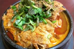 Gamja-tang or pork back-bone stew is a spicy Korean soup made from the spine or neck bones of a pig. It often contains potatoes, cellophane noodles, dried radish greens, perilla leaves, green onions, hot peppers and ground sesame seeds. The vertebrae are usually separated with bits of meat clinging to them.