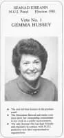 Gemma Hussey is an Irish former Fine Gael politician who served as Minister for Social Welfare from 1986 to 1987, Minister for Labour from January 1987 to March 1987, Minister for Education from 1982 to 1986, Leader of Seanad Éireann and Leader of Fine Gael in the Seanad from 1981 to 1982.
