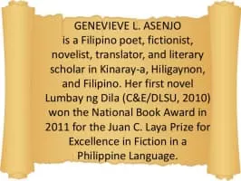 Genevieve L. Asenjo is a Filipino poet, novelist, translator and literary scholar in Kinaray-a, Hiligaynon and Filipino. Her first novel, Lumbay ng Dila, received a citation for the Juan C. Laya Prize for Excellence in Fiction in a Philippine Language in the National Book Award.