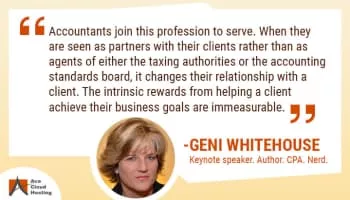 Geni G. Whitehouse, CPA.CITP, CSPM is the Countess of Communication for Even a Nerd Can be Heard in Napa, California. In 2013 she was named one of 25 Thought Leaders in Accounting and for the last 3 years has been "One of the Top 100 Influencers in Accounting." ...