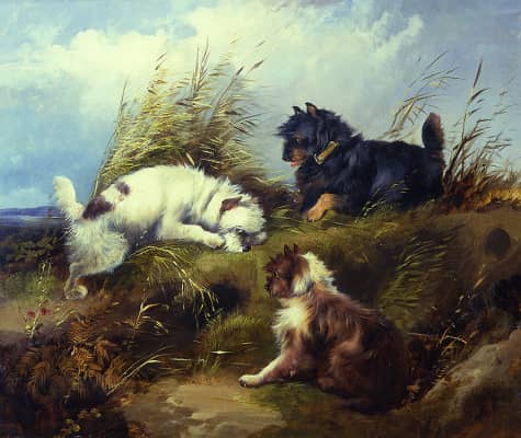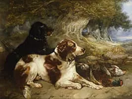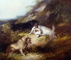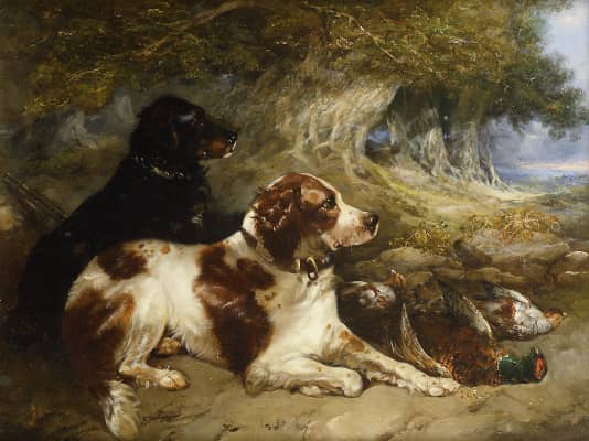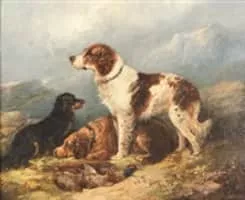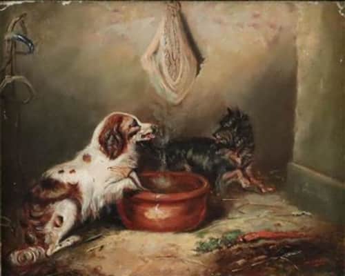 (British, born circa 1808–1893) George Armfield was a British genre artist specializing in oil paintings of domesticated dogs. Armfeld professed a great love of animals, and his commissions of hounds and horses were in high demand in his lifetime.
