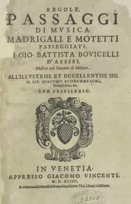 Bovicelli, Giovanni Battista , Italian singer, music theorist, and composer who flourished in the late 16th century. He wrote the important treatise Regole, passaggi di musica, madrigali et motetti passeggiati (Venice, 1594; ed.