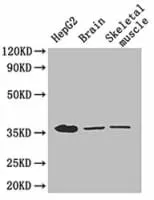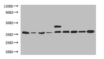 Glyceraldehyde 3-phosphate dehydrogenase is an enzyme of ~37kDa that catalyzes the sixth step of glycolysis and thus serves to break down glucose for energy and carbon molecules.