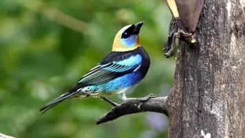 The golden-hooded tanager is a medium-sized passerine bird. This tanager is a resident breeder from southern Mexico south to western Ecuador. Adult golden-hooded tanagers are 13 cm long and weigh 19 g. The adult male has a golden head with a black eyemask edged with violet blue above and below.