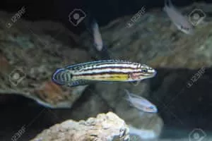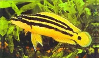 The golden julie is a species of cichlid endemic to Lake Tanganyika, being found only in the extreme northern and southern shorelines of the lake in rocky environs. This species reaches a length of 8. 5 centimetres TL.