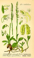 Goodyera repens, an orchid in the genus Goodyera, is called by the common name creeping lady's-tresses in Anglophone Europe and dwarf rattlesnake plantain or lesser rattlesnake plantain in North America. It is a green underground creeper that sends out occasional skinny stems above the surface.