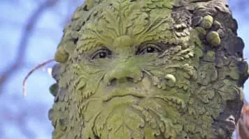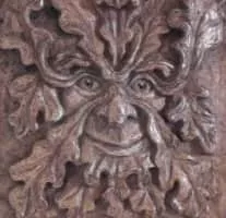 A Green Man is a sculpture or other representation of a face surrounded by or made from leaves. Branches or vines may sprout from the mouth, nostrils, or other parts of the face and these shoots may bear flowers or fruit.