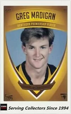 Greg Madigan is a former Australian rules footballer who played for Hawthorn and Fremantle in the Australian Football League during the 1990s. Playing mostly at centre half-back, Madigan was a member of Hawthorn's 1989 VFL Grand Final winning side, in only his 6th league game.