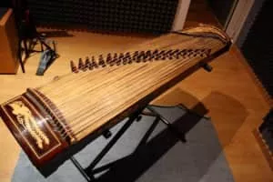The zheng or guzheng, is a Chinese plucked zither. The modern guzheng commonly has 21, 25 or 26 strings, is 64 inches long, and is tuned in a major pentatonic scale. It has a large, resonant soundboard made from Paulownia wood . Other components are often made from other woods for structural or decorative reasons.