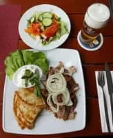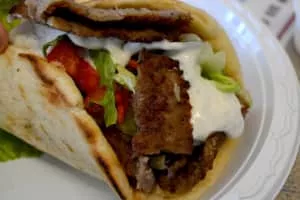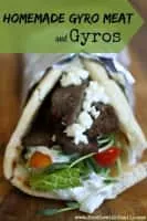 A gyro or gyros is a Greek dish made from meat cooked on a vertical rotisserie. Like shawarma and tacos al pastor, it is derived from the lamb-based doner kebab. In Greece it is now most often pork or chicken, while a mixture of beef and lamb is common in the US and other countries.