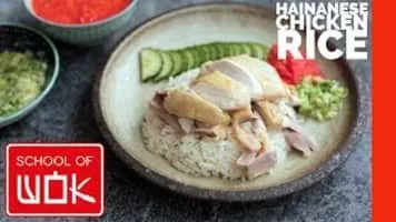 Hainanese chicken rice is a dish of poached chicken and seasoned rice, served with chilli sauce and usually comes with cucumber garnishes. It was created by immigrants from Hainan province in southern China and adapted from the Hainanese dish Wenchang chicken.