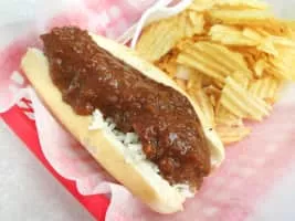 A half-smoke is a "local sausage delicacy" found in Washington, D. C. , and the surrounding region. Similar to a hot dog, but usually larger, spicier, and with more coarsely-ground meat, the sausage is often half-pork and half-beef, smoked, and served with herbs, onion, and chili sauce.