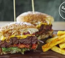 A hamburger, or simply burger, is a sandwich consisting of fillings—usually a patty of ground meat, typically beef—placed inside a sliced bun or bread roll.