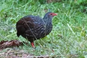 The handsome francolin is a large, up to 35 cm long, terrestrial forest francolin with a dark reddish brown plumage, grey head, red bill and legs, brown iris, bare red orbital skin and rufous grey below. Both sexes are similar. The female is slightly smaller than male. The young has duller plumage.