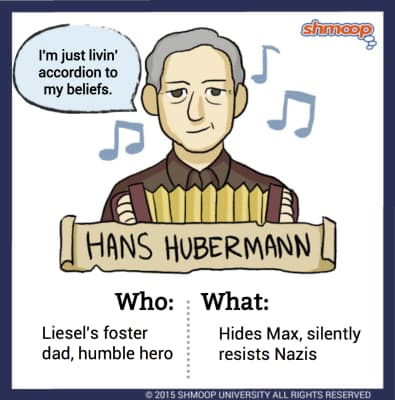 Hans Hubermann is Liesel Meminger's foster father in The Book Thief by Markus Zusak. He is a kind and brave man who does what he can to defy the Nazi party in Germany during the Second World War. Although he opposes Hitler, he knows he must keep up appearances or risk serious danger.