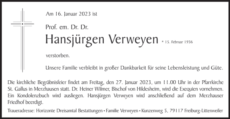 Hansjürgen Verweyen galt als einer der wichtigsten Theologen in der Zeit nach dem Zweiten Vatikanischen Konzil. Er starb am 16. Januar 2023 im Alter von 86 Jahren in Freiburg im Breisgau.