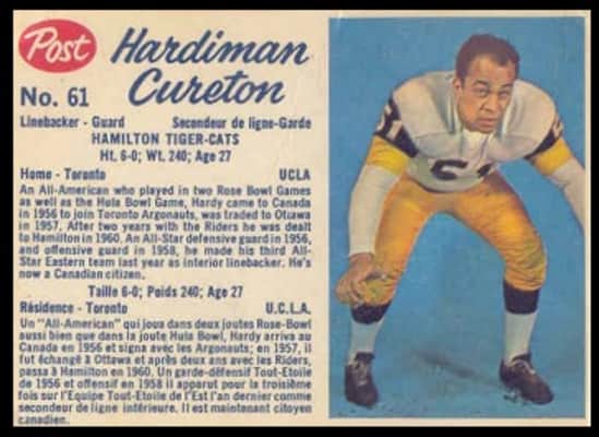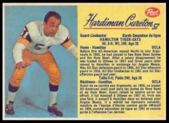 Hardiman Cureton was an American player of Canadian football. He played high school football for the Monrovia Wildcats. He played the tackle position.