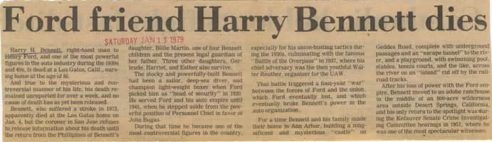 Harry Herbert Bennett, was a boxer, Naval sailor, and businessman. From the 1920s through 1945, he worked for Ford Motor Company and was best known as the head of Ford’s "service department", the company's internal security agency.