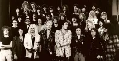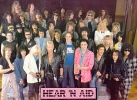 Hear 'n Aid was a charity record recorded by a large ensemble of 40 heavy metal musicians and released in 1986. The project was organized by Ronnie James Dio, Jimmy Bain, and Vivian Campbell, all from the band Dio. Proceeds from the album were used to raise money for famine relief in Africa.