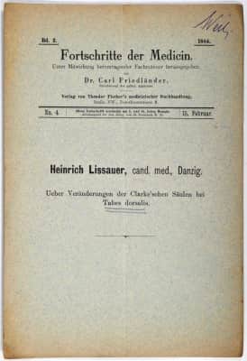 Heinrich Lissauer was a German neurologist born in Neidenburg. He was the son of archaeologist Abraham Lissauer. He studied at the Universities of Heidelberg, Berlin and Leipzig. He was a neurologist at the psychiatric hospital in Breslau, and was a one-time assistant to Carl Wernicke.