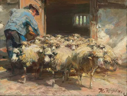 Heinrich Johann von Zügel was a German painter who specialized in pictures of farm and domestic animals, often posed with a human in a dramatic or humorous situation.