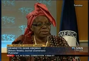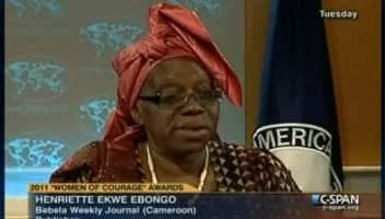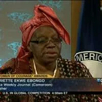 Henriette Ekwe Ebongo is a Cameroonian journalist, publisher and political activist. She was awarded the International Women of Courage Award in 2011. Ebongo advocates freedom of press, gender equality, human rights, and good governance.