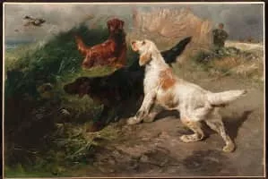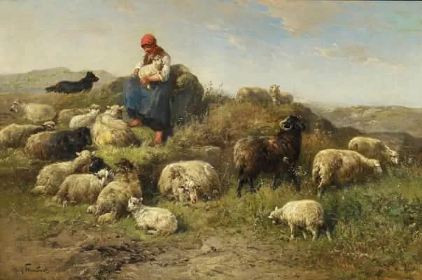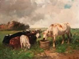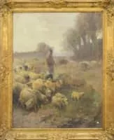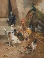Henry Schouten was a Belgian artist best known for painting farmyard scenes of animals in their environment. In addition to his favorite subject matter, Schouten was also known to paint peasants, hunters, and herdsmen as well, as seen in his canvas Walker with Dogs.