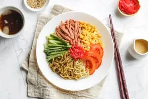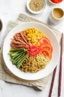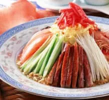 Hiyashi chūka is a Chinese noodle style Japanese dish consisting of chilled ramen noodles with various toppings served in the summer. It is also called reimen in Kansai region and hiyashi rāmen in Hokkaido. Toppings are usually colorful cold ingredients and a tare sauce.