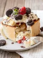 Honey toast, also known as brick toast, is a Japanese dessert that originated from the district of Shibuya during the Japanese asset price bubble, often served at karaoke bars. It is also popular in other parts of the world, most prominently Taiwan and Singapore.