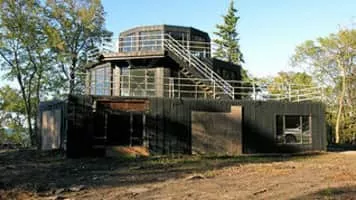 The House of Tomorrow at 241 West Lake Front Drive, Beverly Shores, Indiana, was originally part of Chicago's 1933-34 Century of Progress Exposition. Designed as the house of the future, this house included its own airplane hangar.