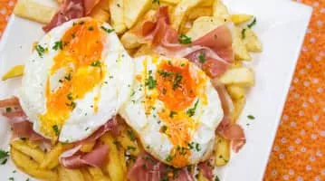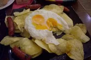 Huevos estrellados or Huevos rotos is any of a number of dishes involving eggs fried in a large amount of olive oil or any other oil. In Madrid, it huevos estrellados is a dish based on a pan-fried egg with a liquid yolk, accompanied by french fries, some kind of meat.
