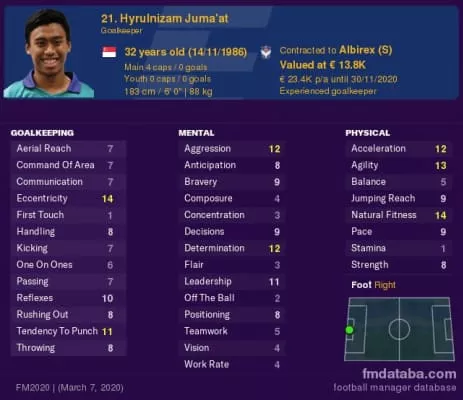 Hyrulnizam Juma'at is a Singaporean footballer who plays for Albirex Niigata Singapore and the Singapore national football team. Hyrulnizam started his professional footballing career with S.League club Young Lions, and has played as a goalkeeper for the entirety of his career.