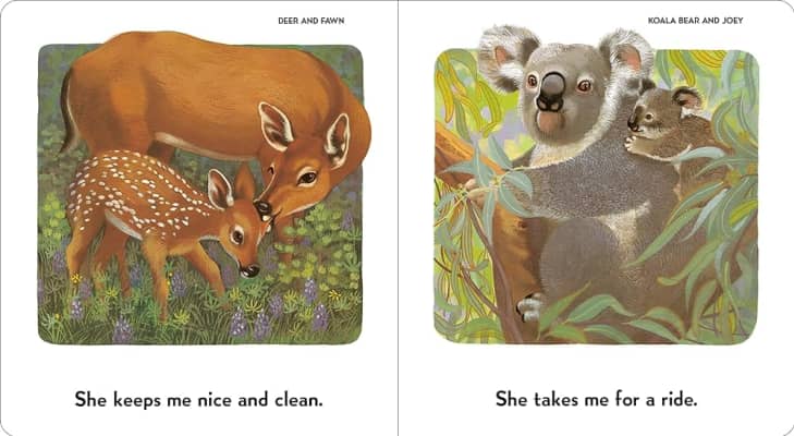 Familiar phrases from a preschooler's world give a child's-eye view of being an animal baby. Many different animal fathers are shown caring for their young.