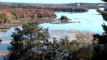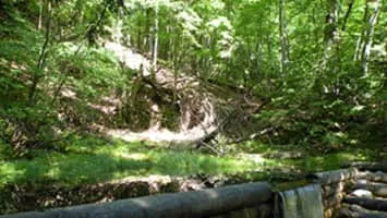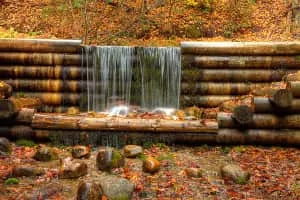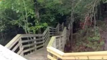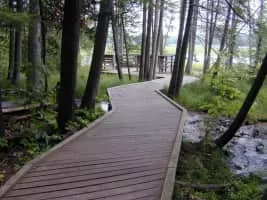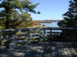 Iargo Springs in Oscoda, Michigan, features several viewing decks and a boardwalk path through the natural springs. Natural springs are formed from water that naturally flows to the surface from underground. The natural springs can be accessed from the road by stairs leading down to the Au Sable River.