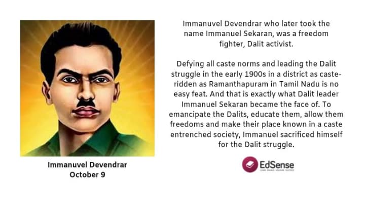Immanuvel Devendrar, who later took the name Immanuel Sekaran, was a freedom fighter, civil rights activist, former soldier and a party worker for the Indian National Congress in Tamil Nadu, India, who was murdered by a group of people from another caste.