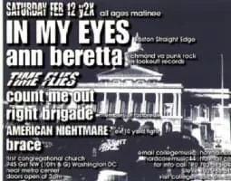 In My Eyes was a Boston straight edge band that spearheaded the 1997 youth crew revival along with Follow Through, Ten Yard Fight, Bane, The Trust, Fastbreak and Floorpunch. The band and its members were a part of the hot bed that was the Boston music scene in the late 90's and early 2000s.