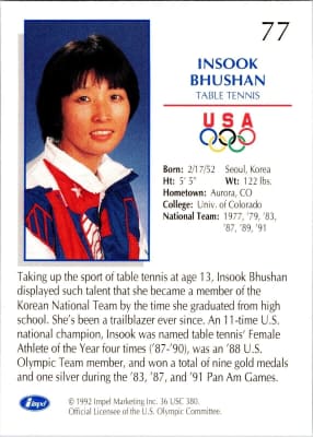 Insook Bhushan is a South Korea-born American table tennis player. She was a member of the South Korean women's team that won the bronze medal at the 1971 World Championships. At the 1973 World Championships, she was limited to the role of "non-playing captain" of the gold medal-winning South Korean women's team.