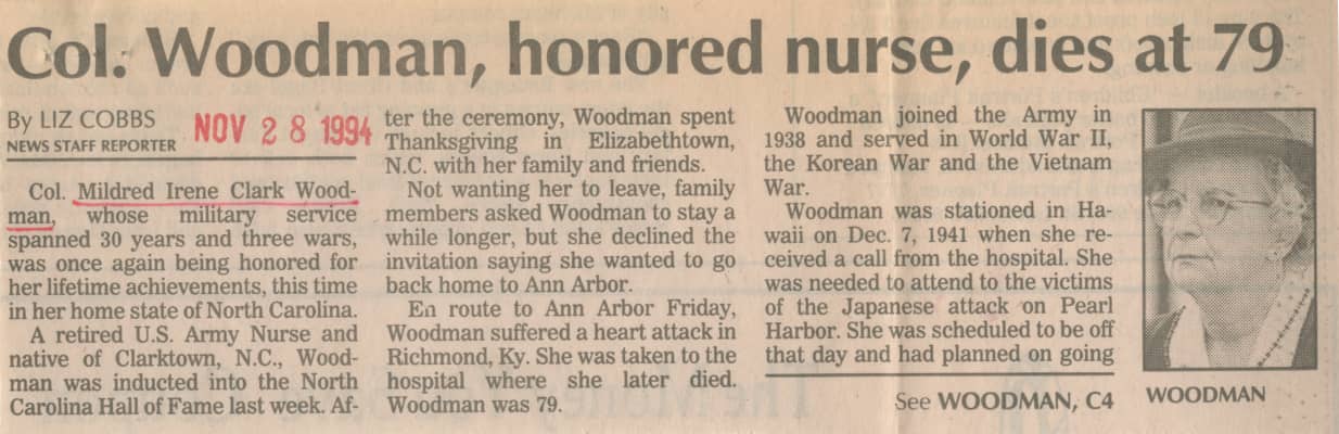 Mildred Irene Clark Woodman was the twelfth chief of the United States Army Nurse Corps. She is credited with, during her tenure, playing a large role in the survival of the Nurse Corps in the Vietnam War. She has been inducted into the Michigan Women's Hall of Fame.