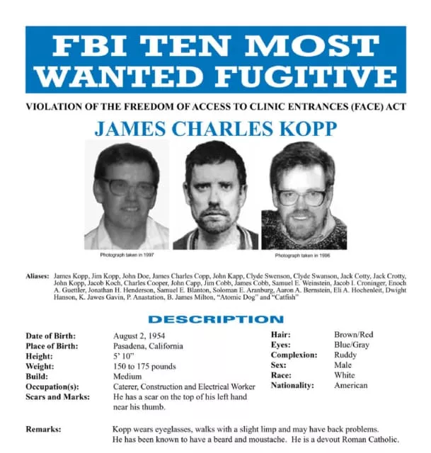 James Charles Kopp is an American citizen who was convicted in 2003 for the 1998 sniper-style murder of Barnett Slepian, an American physician from Amherst, New York who performed abortions. Prior to his capture, Kopp was on the FBI's list of Ten Most Wanted Fugitives.