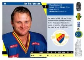 Jan Bo Viktorsson is a retired Swedish ice hockey player. Viktorsson played for his home town club Djurgårdens IF during most of his career, except for two seasons in Austrian side Graz EC. He played a total of 584 Elitserien games for Djurgården and scored 330 points before ending his career in 1999.