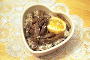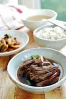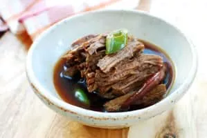 Jangjorim is a Korean side dish consisting mainly of boiled or braised beef and soy sauce. Pork is sometimes used and mushrooms. And some quail eggs are put in with beef or pork.