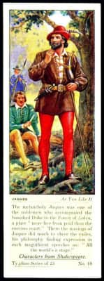 Jaques is one of the main characters in Shakespeare's As You Like It. "The melancholy Jaques", as he is known, is one of the exiled Duke Senior's noblemen who live with him in the Forest of Arden.