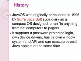 JavaOS is an operating system with a Java virtual machine as a fundamental component, originally developed by Sun Microsystems. Unlike Windows, Mac OS, Unix, or Unix-like systems which are primarily written in the C programming language, JavaOS is primarily written in Java. It is now considered a legacy system.