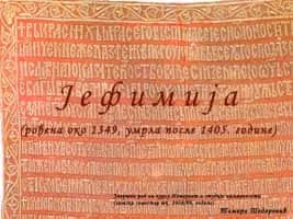 Jefimija, secular name Jelena Mrnjavčević, daughter of Vojihna and widow of Jovan Uglješa Mrnjavčević, is considered the first female Serbian poet. Her Lament for a Dead Son and Encomium of Prince Lazar are famous in the canon of medieval Serbian literature. Jefimija was also as a skilled needlewoman and engraver.