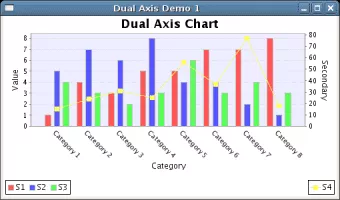 JFreeChart is an open-source framework for the programming language Java, which allows the creation of a wide variety of both interactive and non-interactive charts. JFreeChart supports a number of various charts, including combined charts: X-Y charts. Time axis is possible. Pie charts Gantt charts Bar charts.