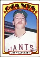 James Arthur Willoughby is a former pitcher in Major League Baseball who played from 1971 through 1978 for the San Francisco Giants, Boston Red Sox and Chicago White Sox. Listed at 6' 2", 185 lb., he batted and threw right handed.
