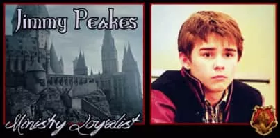 Jimmy Peakes was a student of Hogwarts School of Witchcraft and Wizardry chosen by Harry Potter to be one of the new Beaters for the 1996-1997 Gryffindor Quidditch team. Together with Ritchie Coote he replaced Jack Sloper and Andrew Kirke.
