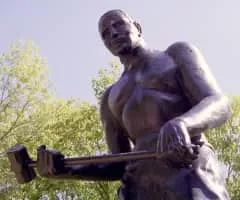 John Henry is an African American folk hero. He is said to have worked as a "steel-driving man"—a man tasked with hammering a steel drill into rock to make holes for explosives to blast the rock in constructing a railroad tunnel.