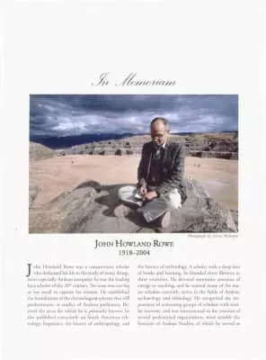 John Howland Rowe was an American archaeologist and anthropologist known for his extensive research on Peru, especially on the Inca civilization. Rowe studied classical archaeology at Brown University and anthropology at Harvard University.